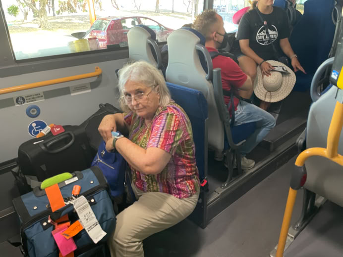 Martha protects our luggage on our unexpected public transportation trip to our hotel in Genoa