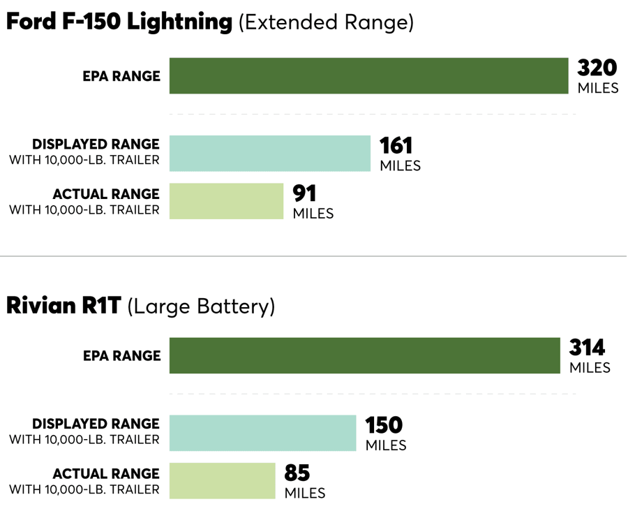 Consumer Reports recently tested the range of 2 EV pickups while towing a TT. Below are the results. In my opinion, these pickups are not ready for towing prime time in the RV world. However as the article points out, these EV trucks have some good towing points, too. Let us know what you think.