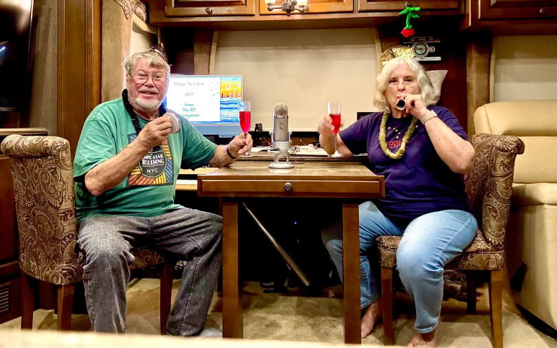 In this episode we share some ideas about cruising (our second love) as well as the latest about the new MH sales ban in CA as well as a Thor large EV motorhome which may answer the question about alternatives. Our experience has taught us some must have items as well as essential techniques for a successful RV trip. We shared these tips and open a bottle of the bubbly during this annual party episode. Have a happy new year as you travel in your RV to all parts of the country.