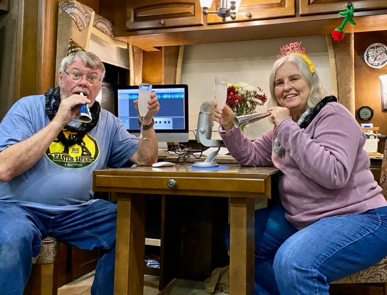The annual end of the year celebration with our listeners takes place on 12/31/2019.  We open the bubbly and talk about the year in review.  The RV Navigator podcast started in 2006 on a whim.  Since then we have shared our travels lives and had many great interactions with our listeners that have been very rewarding for us.  The podcast has grown, but kept its purpose - to inform and give perspective on the world. We have been traveling the world for over 40 years and we love sharing our experiences and hearing from others about their experiences.  As we head into our 70s, we don’t know  how much longer we’ll be doing the podcast health and wealth will determine future episodes However, for the present, we continue on with travel plans for years to come. What will the next decade bring? We hope lots of RVing and travel.  In this episode we share RVing ideas and wrap up our recent travel to the Middle East.  General NYE silliness and ideas for the future take up the hour.
