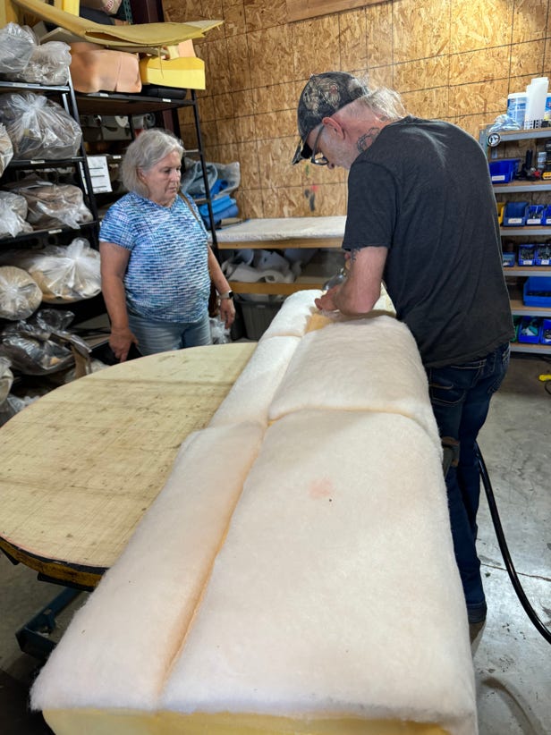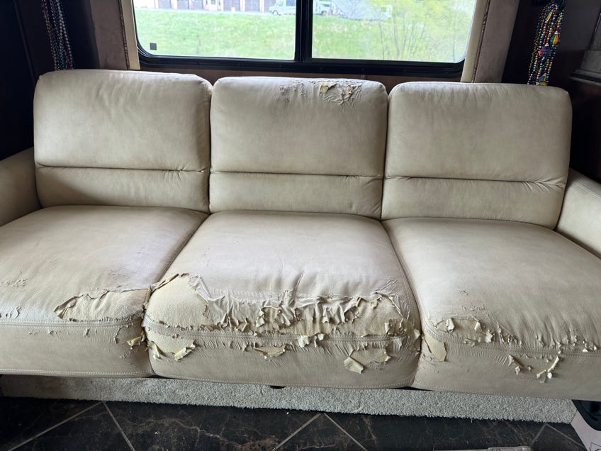 It is officially summer and the camping season has begun - but we'll let the family RVers have first dibs on the campgrounds.  We'll be home for most of the summer. On our way home at the beginning of the month, we stopped to get our sofa recovered.  The original factory fabric had peeled over the past few months, so we had it replaced - now it looks like new.  But of course the real question is why did it peel.  Cheap fabric from the factory.  We learned that the key word is Ultra Leather when looking for quality long lasting fabric.